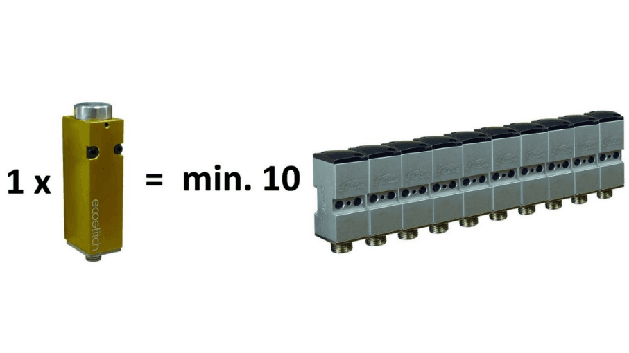 EcoStitch werkt uiterst precies en snel zonder draadtrekken. De grote diameter van de spuitkop voorkomt verstoppingen en minimaliseert vervuiling in de machine.